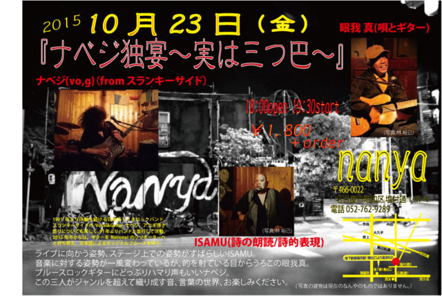 管理人様、告知させて頂きます。 東京よりスランキーサイドのナベジ氏が来演、地元勢としてISAMU(自分)が眼我 真氏を呼び対バンします。 ■10/23(金) 御題: ナベジ独宴 〜実は三つ巴〜 場所: 御器所「なんや」 http://www.nanyagokiso.com 時間: 19時半〜 料金: 千八百円(飲食代別) 出演: ナベジ(V,g)(fromスランキーサイド) ISAMU(詩の朗読/詩的表現) 眼我 真(唄とギター) ※1991年より活動を続ける日本語トリオロックバンド、スランキーサイドのVocal&Guhtarのナベジ。アコギ弾き語りについても同じく91年よりバンドと並行して活