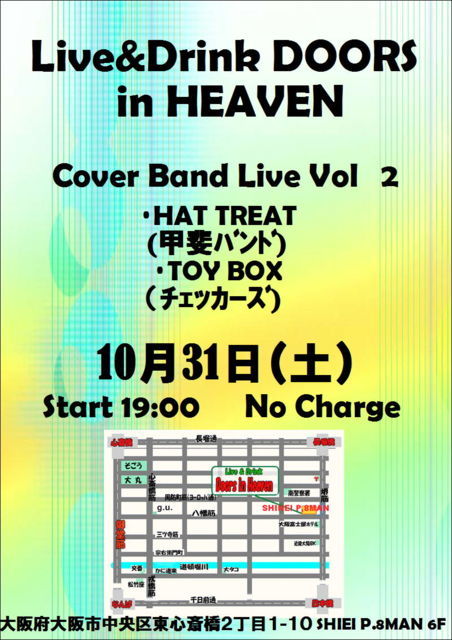 「Cover Band Live Vol2」 日程:10月31日(日) 時間:18:00オープン 19:00スタート 出演: ・HAT TREAT(甲斐バンド) ・TOY BOX(チェッカーズ) 場所:『Live & Drink DOORS in HEAVEN 』 大阪市中央区東心斎橋2-1-10 新栄プロパティ八幡 6階 06-6213-6668 http://howlin.real-sound.net エレベータは5階までしかないのであとは階段で! (地下鉄 長堀橋7番出口5分・日本橋2番出口5分・心斎橋6番出口7分) チャージ:なし!(別途ドリンク・フードを注