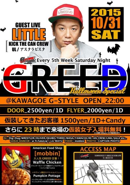管理人様、投稿失礼致します。 小江戸川越もハロウィン一色の当日31日は第5土曜日レギュラーパーティーGREED!クラブG-styleは朝まで大盛り上がり間違いなし! ゲストにKICK THE CAN CREWのLITTLE! 仮装特典満載!出演者全員ガチ仮装! 皆さんも是非仮装してお越しください! ■タイトル JAMPROUD RECORD PRESENTS 「GREED」-Halloween SP- 日時 2015年10月31日(土) ※毎回第五土曜日開催 22:00〜5:00 会場 CLUB G-style 埼玉県川越市菅原町20-3 1F 入場料 \2500/1d フライヤー持参_\2000/1d ●仮装特典