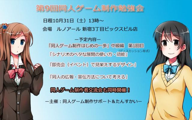 トピ立て失礼します。 同人ゲーム制作サポートのyositaと申します。 第9回同人ゲーム制作勉強会の参加者を募集しております。 ゲーム制作の未経験者〜中級者を対象にしております。 もちろん、上級者の方も歓迎です。 詳細は下記の通りです。 ■日時: 2015年10月31日(土曜日) 13:00〜17:00 ■場所 ルノワール貸会議室(新宿3丁目ビッグスビル店マイ・スペース (貸し会議室) ■定員 25名 ■参加費 1,000円(ワンドリンク代込み) ■参加受付締切 10月25日(日曜日) ■参加申込 下記特設ページ内のフォームより参加受付中です。 http:/