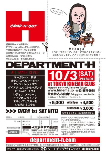 10月3日第1土曜日デパートメントH 2099 open 24:00 @鶯谷東京キネマ倶楽部http://www.kinema.jp  03−3874−7988 ¥5000/ ¥4500フライヤー持参/ ¥3000ドレスコード 飲食持込自由。会場内でアルコール類の販売はしておりません。 男女更衣室有り。 写真付IDチェック有り。 香盤表 0105 OP:DQ紹介 0120 ソワレhttps://twitter.com/soireetoile         http://www.soiree.in 0150 林幽玄https://twitter.com/yuugen_hayashi 0220 HIROKAz https://twitter.com/larock_xephor 0240