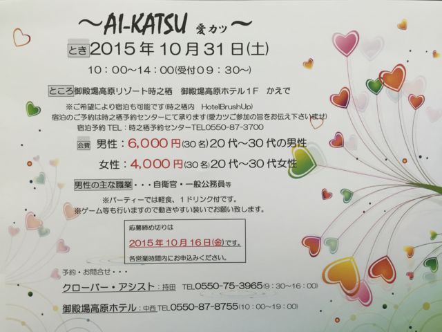 Ê¿À®27ǯ10·î31Æü(ÅÚ)¡¡ ÃËÀ30̾¡§½÷À30̾ ǯÎð¡§20Âå¡Á30Âå ½Ð²ñ¤¤¤òµá¤á¤Æ¤¤¤ëÊý¤¼¤Ò¡ª¡ª ¥²¡¼¥à¤ä¹ðÇò¥¿¥¤¥à¤Þ¤Ç¡¦¡¦¡¦ ÃËÀ¤Ï¼«±Ò´±¡¢°ìÈ̸øÌ³°÷¡¢²ñ¼Ò°÷Åù¡¦¡¦¡¦ ²ñÈñ¡§ÃËÀ6,000±ß¡¡½÷À4,000±ß¡¡ ½¸¤Þ¤ê¼¡ÂèÄù¤áÀÚ¤ê¤Ç¤¹¡ª¡ª¡ª¤¹¤°¤Ë¤ªÅÅÏò¼¤µ¤¤¥Ï¡¼¥È(¥ê¥Ü¥ó) ¤Þ¤¿¿¿·õ¤Ë½Ð²ñ¤¤¤òµá¤á¤Æ¤¤¤ëÊý¤Î¤ß¿½¹þ²Ä¤Ç¤¹¡ª ꥯ¥í¡¼¥Ð¡¼¡¦¥¢¥·¥¹¥È TEL0550-75-3965(9¡§30¡Á16¡§00)MAIL¤«¤é¤â¼õ¤±ÉÕ¤±¤Æ¤ª¤ê¤Þ¤¹ ¡£¥¢¥É¥ì¥¹clover_tour@arion.ocn.ne.jp ..Ê罸´ü¸Â 2015ǯ10·î01Æü