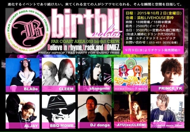 2015年10月2日(金曜日) 【birth!!vol.65】 <会場> 浜松LIVEHOUSE窓枠 (静岡県浜松市中区板屋町100-10) <時間> 18:00 OPEN/18:30 START <チケット> 前売券-2,500円(+500D代) 当日券-3,500円(+500D代) (9月9日イープラスにて発売開始) ※ 整理番号あり <出演アクト一覧> CLEEM BLADe PRINCE.YK shangmin BBQ-MOMB ALJAY マジカル♡パレード BEACH AYU(ex:CLEEM) シン(united music TRIAL) DJ donga Katsuya(birth tracks) チケットのお求めはイープラス… http://sort.eplus.jp/sys/T1U14P00108