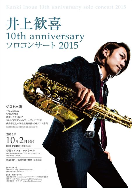 音楽活動10周年を記念して、10月2日に、出身・在住の兵庫県伊丹市でソロコンサートを開催させていただくことになりました。 そのコンサート専用のFacebookページを開設し、コンサートの様々な情報を発信してまいりたいと思います!よろしくお願いいたします! このコンサートを通じて、これまでお世話になった方々や関わってくださったミュージシャンの皆様、地元伊丹への感謝の気持ちと、30代になり更に活動の幅を広げ、新しい事にチャレンジしていこうという決意をお伝えできればと思います。 コンサートでは、リーダーを務めるメインバ
