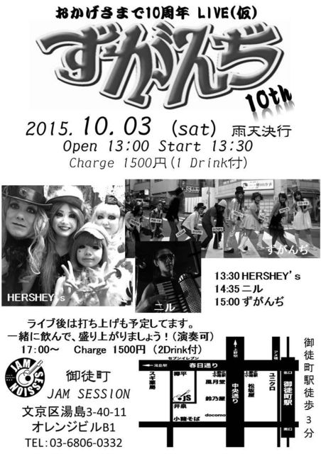 10·î¤ÏÆüËܺÇÂç¤Î¤¹¤«¤ó¤Á¥³¥Ô¡¼¥Ð¥ó¥É½¸ÃÄ¡¢¤º¤¬¤ó¤Â¡Êhttp://www.geocities.jp/zgandi_greco/¡Ë¤Î10¼þǯµÇ°¥é¥¤¥Ö¤ËÀøÆþ¡ª 50ʬ´Ö¤¿¤Ã¤×¤ê¤ä¤ê¤Þ¤¹¤è¡Á¡ª46492¡ª ¡ú10·î3Æü¡ÊÅڡ˸æÅÌÄ®JAM SESSION¡¡¡Êhttp://jamsession.jp/¡Ë ¡Ø¤ª¤«¤²¤µ¤Þ¤Ç10¼þǯ¡ªLIVE¡Ù OPEN 13:00 START 13:30 ¥Á¥ã¡¼¥¸¡¡¡ï1500¡Ê£±drink¡¦¤ª¤ß¤ä¤²ÉÕ¤¡Ë ½Ð±é 13¡§30¡Á¡¡HERSHEY's 14¡§35¡Á¡¡¥Ë¥ë 15¡§00¡Á¡¡¤º¤¬¤ó¤Â ¥»¥Ã¥·¥ç¥ó¤¢¤ê