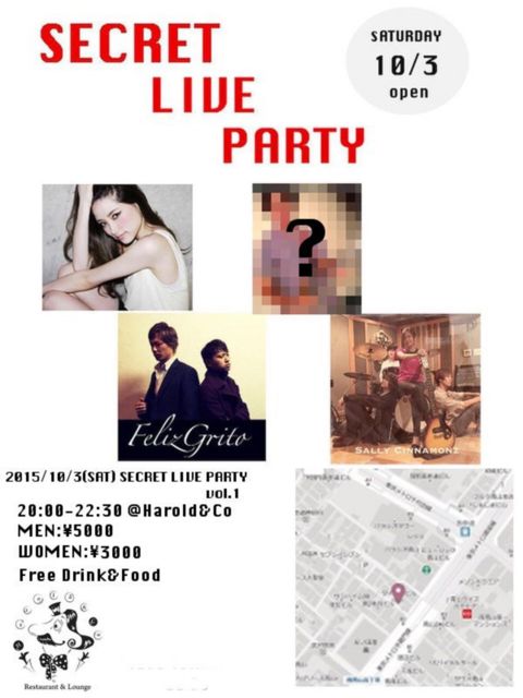 ¡ë¡ö.SECRET LIVE PARTY ¡ö¡ë 100¿Íµ¬ÌϤθòή¥Ñ¡¼¥Æ¥£¡¼¡ª¡ª¡ª ¡Á2015ǯ10·î3Æü¡Á »þ´Ö:19:50¡Á22:30 (last order22:30) 20:20¡ÁLIVE start 22:30¡Áend ¾ì½ê:ɽ»²Æ» Harold & Co(¥Ï¥í¥ë¥É&¥³¡¼) http://www.hotpepper.jp/strJ000774826/ °û¤ßÊüÂê + ·Ú¿©ÉÕ¤ ÎÁ¶â:ÃËÀ \5.000 ½÷À ( ³ØÀ¸²Ä) \3.000 ¢¨Í½ÌóÀ©¤È¤Ê¤Ã¤Æ¤ª¤ê¤Þ¤¹ ( 120¿Í¤ÇÄùÀÚ¤ê¤È¤µ¤»¤ÆÄº¤¤Þ¤¹ ) ÉþÁõ:¥Ý¥¤¥ó¥È¥Û¥ï¥¤¥È¥³¡¼¥Ç (¾®Êª¤Î¤ßNG ˹»ÒOK)