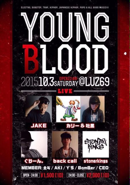 10/3 毎月第1土曜日@LUZ69 New Generation Party 『YOUNG BLOOD』 今回は若手ラッパーを集めたLive Showcaseあり!!!! YOUNG BLOODからは 【BomBer & C.E.O】 JAKEは関西を主とした様々な現場で培った経験と実力を 10/3日、帰鳥1発目のLiveで披露!! そして若手現役環境大学生 【吐黒&カリー】 倉吉で活動してる 【 ぐりーん】 の独特なLiveにも注目!! SoundCloudに自曲をUPしネットラッパーとして活動を続けてきた 【Back Call】 ついに初ステージへ!! そして、PROP SPOTからDJ MsもPLAYします!! 今シーンで一番勢いの