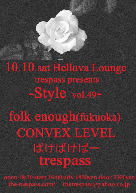 10/10(ÅÚ) ¿À¸ÍHELLUVA LOUNGE trespass presents¡ÈStyle¡Évol.49 open 18:30 start 19:00 adv 1800yen door 2300yen ¡úfolk enough ¡úCONVEX LEVEL ¡ú¤Ð¤±¤Ð¤±¤Ð¡¼ ¡útrespass ¼«¼ç´ë²èÂè49ÃÆ¤Îº£²ó¤Ï¡¢Ê¡²¬¤¬¸Ø¤ë¥ª¥ë¥¿¥Ê¥Æ¥£¥ô¡¦¥í¥Ã¥¯¡¦¥Ð¥ó¥Éfolk enough¤Î¥ª¡¼¥¿¥à¡¦¥Ä¥¢¡¼¿À¸ÍÊÔ¡ª¡ª ¾åȾ´ü¤ÎÅÜÅó¤Ë¤·¤Æ·ãÎõ¥á¥ó¥Ä¤Ë¤è¤ë¥¸¥ç¥¤¥ó¥È¡¦¥Ä¥¢¡¼¤ò·Ð¤Æ¡¢¤µ¤é¤Ê¤ë¿Ê²½¤ò³¤±¤ëÍ£°ì̵Æó¤Î¥°¥ë¡¼¥ô¤Ïɬ¸«¡¦É¬Ä°¡ª¡ª ·Þ¤¨¤ë´ØÀ¾Àª¤Ï¡¢ºòǯ·ëÀ®28ǯÌܤˤ·¤Æ6ËçÌÜ¤È¤Ê¤ë·æºî¥Õ¥ë¡¦¥¢¥ë¥Ð¥à¡Èdonotcl¡É¤ò¥ê¥ê¡¼¥¹¤·¤¿Å´ÊɤΥ¹¥ê¡¼¥Ô¡¼¥¹