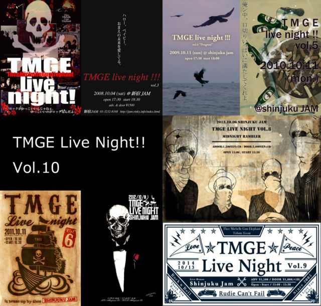 for TMGE Junkies 今年も新宿JAMにてTMGE Live Night!!を開催します。 10回目を迎えた2015年は過去最大、総勢14バンドによる thee michelle gun elephant トリビュートイベントです。 解散の日、10/11に開催します。 あの日幕張に居た人も、行けなかった人も、盛大にTMGEに浸りませんか? たくさんのお客様にご来場いただけますよう、お待ちしております。 ※参加ご希望の方は、メッセージ下さい!前売りでご案内致します。 ---------------------------- TMGE Live Night!! Vol.10 @新宿JAM 2015/10/11(Sun) OPEN 11:00
