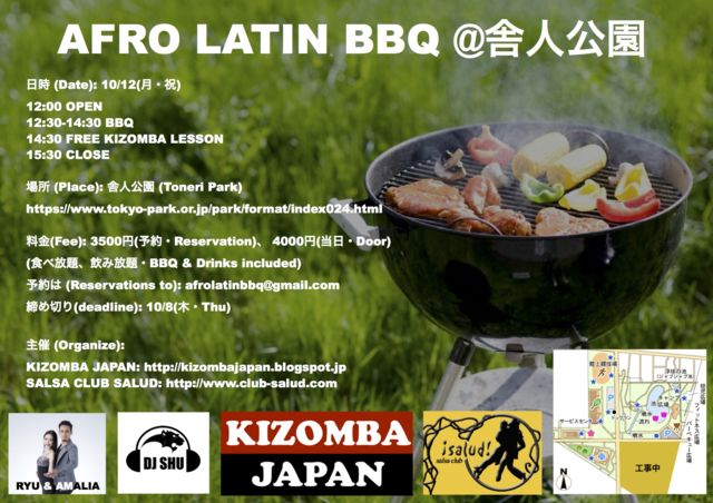 Afro Latin BBQ @舎人公園BBQ広場 食欲の秋真っ只中、Afro Latinダンスを楽しみながら、バーベキューしませんか? 飲み放題、食べ放題にKizomba無料ミニレッスンも付いています! DJ TimeはKizomba, Bachata, Salsa & More。 肉食ダンサーの皆さん、ご参加お待ちしてます!! ◆日時:10月12日(月・祝)12:00-15:30 ◆場所:舎人公園BBQ広場( サルーの旗が目印です) 日暮里舎人ライナー『舎人公園駅』から徒歩3分 https://www.tokyo-park.or.jp/park/format/index024.html ◆ 料金: 予約: 3500円(食べ放題&飲み放題付)