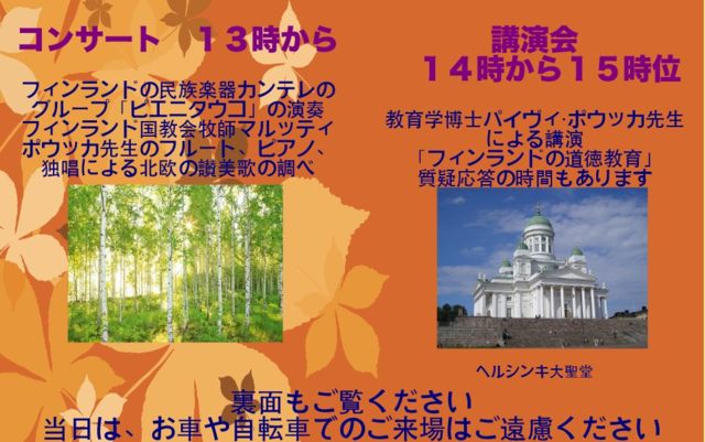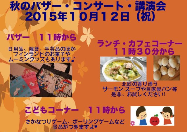 10月12日(祝)、東京都中野区にあるスオミ教会にて、秋のバザー・コンサート・講演会が行われます。 11時〜 バザー、日用品、手芸品のほか、フィンランドのお菓子やムーミングッズ、こどもコーナー 11時30分〜 ランチ・カフェコーナー、サーモン・スープ 13時〜 コンサート、フィンランドの民族楽器カンテレのグループ「ピエニタウコ」の演奏、フィンランド国教会牧師マルッティ・ポウッカ先生のフルート、ピアノ、独唱による北欧の讃美歌の調べ 14時〜15時位 「フィンランドの道徳教育」、教育学博士パイヴィ・ポウッカ先生