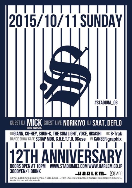 本日10/11(日)のHARLEMは STADIUM 12th ANNIVERSARY@渋谷HARELM OPEN 22:00 2フロア800人規模東京最大HIPHOP PARTY!! MICK来日! LIVEにNORIKIYO出演! ★★★★★★★★ DISCOUNT↓ 「ボーゲンのゲストでユウ」で 男女1500/1D 詳細 STADIUM 12TH ANNIVERSARY 2015/10/11 SUNDAY 22:00 OPEN 3000/1Drink 20歳以上 IDチェック有り (顔写真付きID) HARLEM GUEST DJ MICK (From NewYork) GUEST DJ NORIKIYO DJ: SAAT / DEFLO / GIANN / CO-HEY / SHUN-K / SAMLIGHT / YOKE / HI