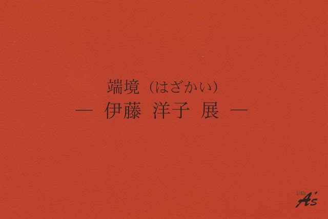 to, Yoko's solo exhibition [Period] 2015/10/12 月曜 〜 2015/10/17 土曜、 [GINZA ギャラリー アーチストスペース] にて、 伊藤 洋子 個展 [端境 (はざかい)] やります。 12:00 〜 19:00 (最終日 18:00 まで) 初日 17:00 より ささやかなパーティを催します。 [GINZAギャラリーアーチストスペース] の地図・最寄駅・住所・Tel・メールアドレス は こちらをクリック。 http://www2u.biglobe.ne.jp/~hinden/map/aachisuto/