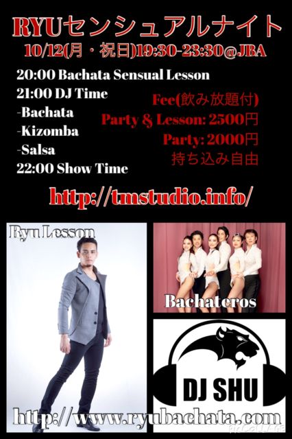 ★RYUセンシュアルナイト★ バチャータセンシュアルをたっぷり楽しめるイベントです。 もちろんサルサやキゾンバも楽しめます! NO FALTES!! ◆日時:10月12日(月・祝日)19:30-23:30 ◆場所:小伝馬町『STUDIO JBA』 中央区日本橋大伝馬町11-8 HATビルB1 TEL 03-6231-0638 東京メトロ日比谷線『小伝馬町駅』1番出口より徒歩3分(1番出口を出て右に歩き、さわやか信用金庫の手前を右折。3つ目の交差点のから2番目のビルで、郵便局の向かい) 都営新宿線『馬喰横山』徒歩5分 都営浅草線『東日本橋駅』徒歩6分 JR総武本線