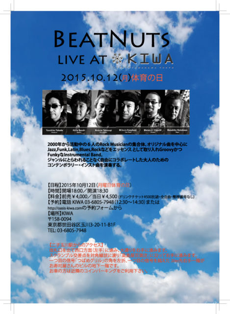 バースデーライブ、15周年ライブとゲスト入りのライブが続きましたが 6人の BN サウンドに戻ります。 包国 充 Sax Flute 鈴木 晶 Guitar 福田裕彦 Keybord 六川正彦 Bass 樋口晶之 Drums 高杉 登 Percussion 2015 10/12 (月・体育の日) 場所:二子玉川 KIWA Open 18:00 Start 18:30 チャージ:予約¥4,000 当日¥4,500 【予約】KIWA <KIWAでの予約方法> 電話 KIWA 03-6805-7948(12:30〜14:30)まで http://oasis-kiwa.com/の予約フォームから 〒158-0094 東京都世田谷区玉川3-20-11-B1F TEL: 03-68