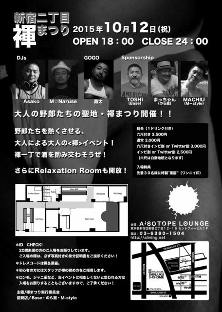 今回、大人による大人の野郎たちに向けた<褌>イベントを企画しました。 ロン毛、ジャニ系など、当イベントに相応しくない方は、入場をお断りすることもございますが、今回は20代の方にも参加頂けるようにしました! 「新宿二丁目 褌まつり」 日時: 10/ 12 (祝) 18:00〜24:00 場所: AiSOTOPE LOUNGE 新宿区新宿2-12-16 セイントフォービル1F 03(6380)1504 料金(1D付き):六尺付き3,500円、通常 3,000円、六尺付きインビ割 or Twitter割 3,000円、インビ割 or Twitter割 2,500円 入場先着特典:特製黒猫を30名様にプレゼント!