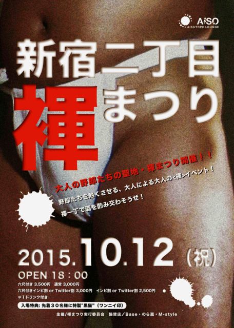 <PR>管理人様、失礼致します。 宣伝させていただきます。不都合であれば削除してください。 今回、大人による大人の野郎たちに向けた<褌>イベントを企画しました。 「新宿二丁目 褌まつり」 日時: 10/ 12 (祝) 18:00〜24:00 場所: AiSOTOPE LOUNGE 新宿区新宿2-12-16 セイントフォービル1F 03(6380)1504 料金(1D付き):六尺付き3,500円、通常 3,000円、六尺付きインビ割 or Twitter割 3,000円、インビ割 or Twitter割 2,500円 入場先着特典:特製黒猫を30名様にプレゼント! DJ:Asako,M☆Nature GOGO:勇太,TOSHI,MACHIU