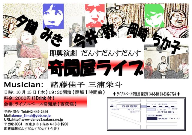 2015ǯ 10·î¤Î¡Ö´ñʹ²°¥é¥¤¥Ö¡×¤Î¤ªÃΤ餻¤Ç¤¹¡ª¡ª ¡ú´ñʹ²°¥é¥¤¥Ö¡ú Æü»þ¡§10/15(ÌÚ)19¡§30³«±é(³«¾ì1»þ´ÖÁ°) ²ñ¾ì¡§¥é¥¤¥Ö¥¹¥Ú¡¼¥¹´ñʹ²°(À¾²®·¦) ¡¡¡¡¡¡¿ùʶèÀ¾²®Æî3-8-8 B1 03-3332-7724 ¡¡¡¡¡¡http://www.kibunya.jp/ ÎÁ¶â¡§2000±ß(1¥É¥ê¥ó¥¯ÉÕ) ½Ð±é¡§º£°æÆØ¡¿Í¼Äá¤ß¤¡¿²¬ºê¤Á¤«»Ò Musician¡§½ôÆ£²Â»Ò¡¿»°±º±ÉÅÍ À§È󤪱ۤ·²¼¤µ¤¤¤Þ¤»¡ª¡ª ¤´Ï¢Íí¤ªÂÔ¤Á¤·¤Æ¤¤¤Þ¤¹¡ª¡ª ¢¡Â¨¶½±é·à ¤À¤ó¤¹¤À¤ó¤¹¤À¤ó¤¹ ¡¡http://www.dance3.sakura.ne.jp/