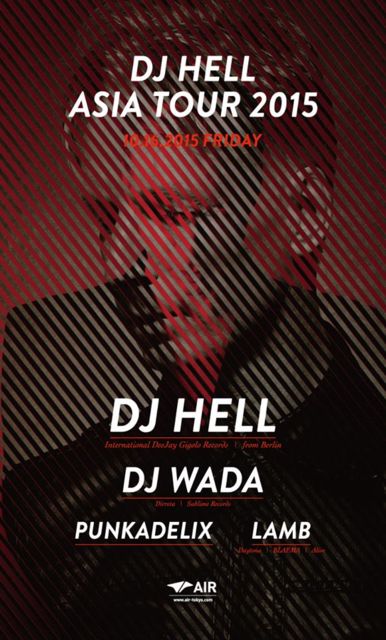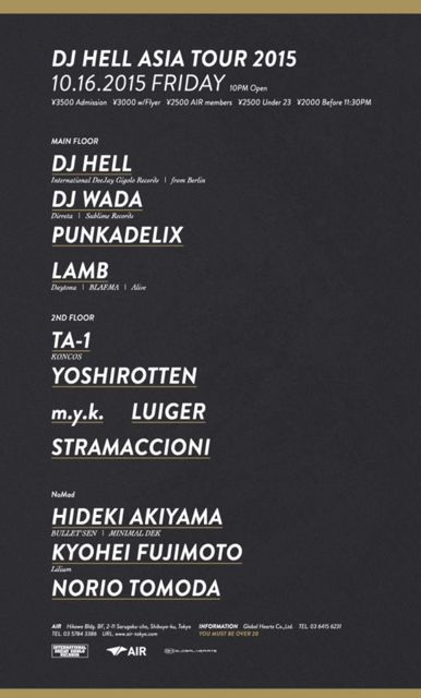 !!! º®»¨¤¬Í½ÁÛ¤µ¤ì¤ë°Ù¡¢¥ê¥¹¥È¤ÏÀèÃå½ç¤Ë¤Æ !!! 2015.11.16.sat DJ HELL ASIA TOUR 2015 - at AIR 10pm MAIN FLOOR: DJ HELL (International DeeJay Gigolo Records | from Berlin) DJ WADA (Dirreta | Sublime Records) PUNKADELIX LAMB (Daytona | BLAFMA | Alive) 2ND FLOOR: TA-1 (KONCOS) YOSHIROTTEN m.y.k. STRAMACCIONI LUIGER NoMad: Hideki Akiyama (BULLET'SEN | MINIMAL DEK) Kyohei Fujimoto (Lilium) Norio Tomoda ¡ØÀ¤³¦¥È¥Ã¥×¤Ë·¯Îפ·Â³¤±¤ë¥¢¡¼¥Æ¥£¥¹¥È¤¬Ìó3ǯ¤Ö¤ê¤ËAIR¤Øµ¢´Ô¡Ù 3ǯÁ°¤Î¥«¥¦¥ó¥È¥À¥¦