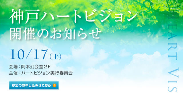 昨年、大阪で大好評だったハートビジョンのイベントが、この秋には神戸で開催されます。 ハートを思いだせば、人生が大きく変わります。 ハートのなかには、ずっと求めてきた宝物があります。 ユニティインスティチュートは、ハートの働きを基盤とした、さまざまなトレーニングやワークショップを提供しています。 その3つの柱として、ハート瞑想、サトルボディヒーリング(SBH)、エッセンシャルライフコンサルティング(ELC)があります。 ハート瞑想は、ハートへの気づきを使った瞑想法です。 日常生活のなかでハートを思