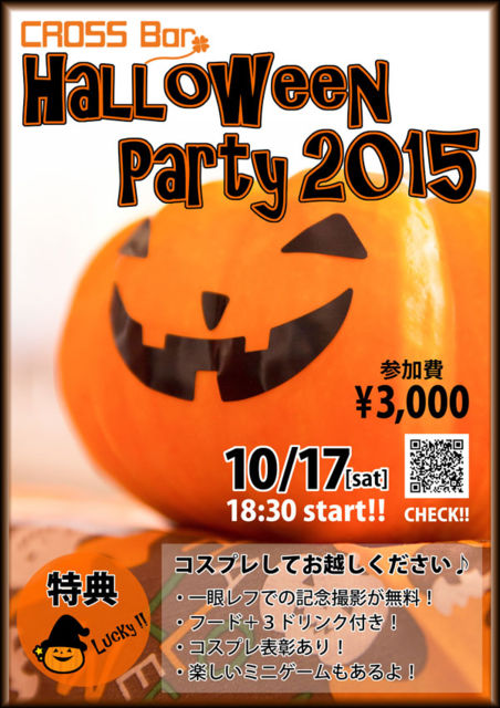 管理人様、スペースをお借りします。 有難うございます! 10月17日(土)にハロウィンパーティーをします♪ ハロウィンに先立って、コスプレをして、皆で仲良くしませんか? ・¥3,000で軽食と3ドリンク付! ・コスプレ表彰あり! ・一眼レフでの写真撮影無料! ・ミニゲームもあります! ・お友だちとの参加OKです! ※今のところ、男女合わせて10名程が参加予定ですが、まだまだ募集しております♪ 【開催日時】 10月17日(土) 18:30〜 【場所】 CROSS Bar http://crossbar.sub.jp/ 西宮市平松町1-25