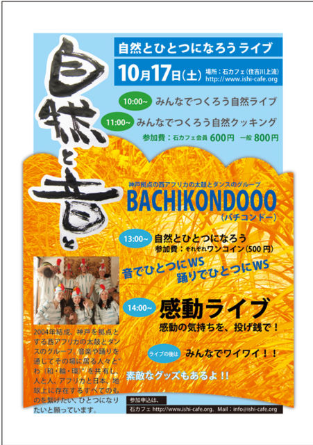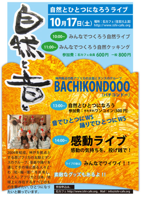 自然と一つになれるイベントを・・・したい・・・ 木を叩き、石を叩き、手を叩き、声を出す 川の水音に負けない音と踊りと・・・ 神戸を拠点として活躍する西アフリカの太鼓とダンスの「バチコンドー」 が、石カフェに来てイベントを開催します。 ・10:00~ みんなでつくろう自然ライブ ・11:00~ みんなでつくろう自然クッキング 参加費:800円(石カフェ会員600円) ・13:00~ 自然とひとつになろう 参加費:ワンコイン(500円) ・14:00~ 感動ライブ (投げ銭) ・ライブの後は、みんなでワイワイ ・バチコンド
