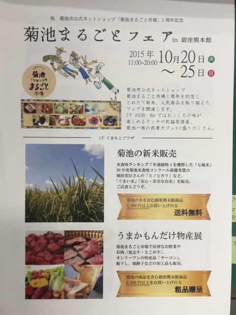 10月20日から25日まで 東京・銀座熊本館にて「菊池まるごとフェア」を開催します 九州一の新米「菊池米」の販売やお肉の試食販売 ほっとするようなおふくろの味ランチや、初開催の「武者カフェ」など 趣向を凝らしたイベントです♪ 銀ブラで疲れたら、ちょっと足を伸ばして、銀座5丁目、ソニービル隣の 「銀座熊本館」へ、ぜひどうぞ。 ★銀座熊本館 http://kumamotokan.or.jp/index.php
