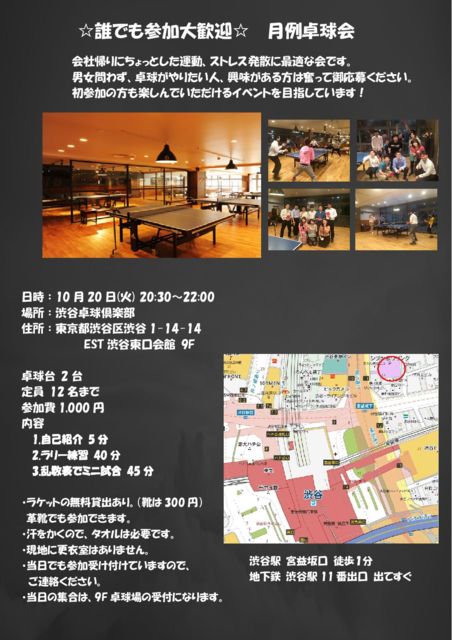 会社帰りにちょっとした運動、ストレス発散に最適な会です。 男女問わず、卓球がやりたい人、興味がある方は奮って御応募ください。 ご無沙汰振りに開催。 初参加の方も楽しんでいただけるイベントを目指しています。♪ 日時:10月20日(火) 20:00〜22:00 場所:渋谷卓球倶楽部 住所:東京都渋谷区渋谷1-14-14 EST渋谷東口会館 9F 渋谷駅 宮益坂口徒歩1分 地下鉄 渋谷駅11番出口 出てすぐ 卓球台 2台 定員 12名 参加費 1,000円 内容 1.ローテーション ラリー練習 45分 2.乱数表でミニ試合 45分 ・ラケットの
