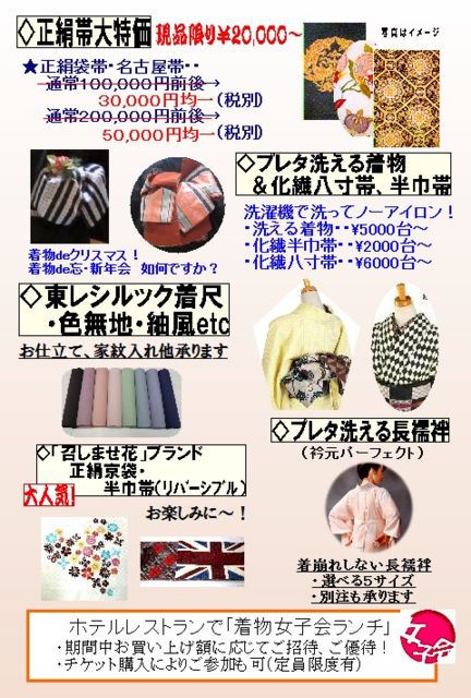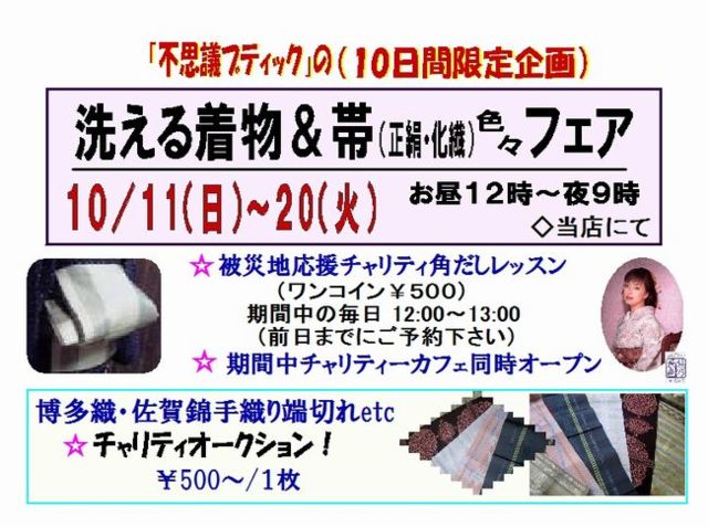 20日最終日! 「洗える着物&帯(正絹・化繊)色々フェア」 洗える着物フェア最終日恒例 「チャリティおはぎの日」 ドリンク持込みoneコインチャリティ着物女子会は 10月20日お昼12時〜夜10時まで・・・ 翌日には京都に帰る和物達と名残を惜しみながら 秋の夜長に楽しい着物トークで盛り上がりましょうね♡ 期間・・・10月11日(日)〜20日(火)までの10日間限定 最終日までの三日間は「チャリティおはぎの日」同時開催 期間中はお昼12時〜夜9時 チャリ