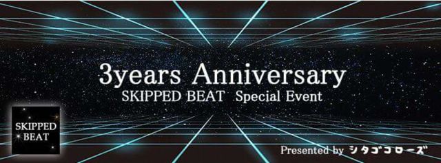 facebookから勝手に引用← ドタ参OKなので是非祝いましょう!\(^o^)/ いつもスキップビートをご愛顧頂きありがとうございます! スキップビートも満3歳を迎えました♪ これもひとえに皆さまのご愛顧のおかげと感謝の気持ちでいっぱいです! 今後もサザンを歌って、踊って、騒いで、語れる、楽しい場所を提供できるよう頑張っていきますので今後とも末永く、どうぞ宜しくお願い致します。 つきましてはスキップビート3周年を記念してパーティーを行いたいと思います。 当日はスキップビートから生まれたおっさんユニット「シタゴコローズ