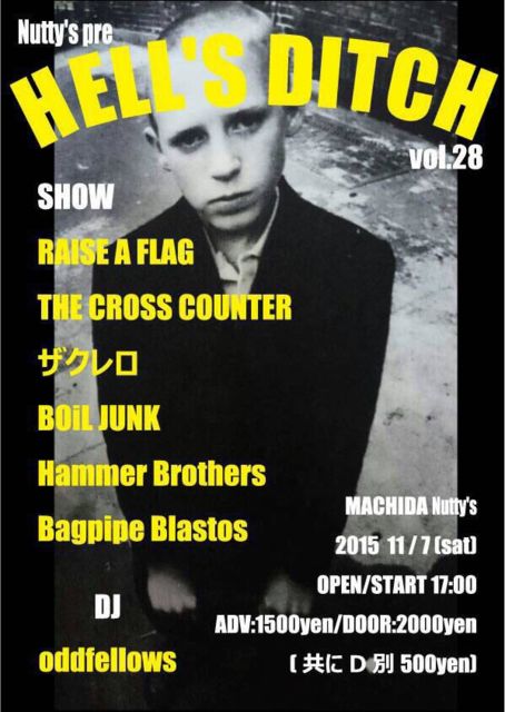 RAISE A FLAG次のLIVEは11月7日(土)町田Nutty'sの企画に出演します。 初めて対バンするバンドがいたり、久しぶりに対バンするバンドもいたりでアツい夜になりそうな予感です。 9か月ぶりの町田。 よろしくお願いします。 以下告知↓ 町田Nutty's Presents 『HELL'S DITCH vol28』 □開催日:2015年11月7日(土) □場所:町田Nutty's □OPEN/START 17:00 □チケット:前売1,500円/当日2,000円 ドリンク別 ≪出演≫ ■THE→CROSS COUNTER ■BOiLJUNK ■Hammer Brothers ■Bagpipe Blastos ■ザクレロ ■RAISE A FLAG ≪