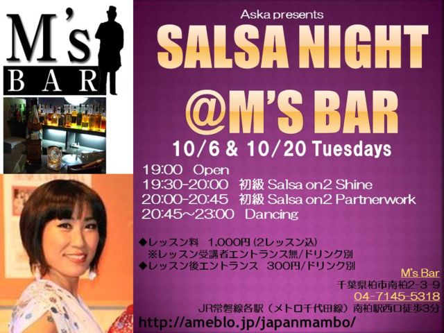 Aska presents Salsa Night@南柏M's Bar 第1、第3火曜の開催です!南柏のアットホームなバーでまったりと飲んで踊って笑って語って、楽しい夜を過ごしましょう。選曲はサルサ、マンボ、バチャータ、メレンゲ、チャチャ!7月は今大人気のパチャンガと、サルサON2レッスンです^^初心者さん大歓迎♪ 【日程】 10/20 火曜日 【時間】 19:00 オープン 19:30-20:00 初級Salsa on2 シャイン 20:00-20:45 初級Salsa on2ペア 20:45〜23:00 フリータイム ☆19:15までにお越し頂いた方に、ウェルカムドリンクサービスあり!