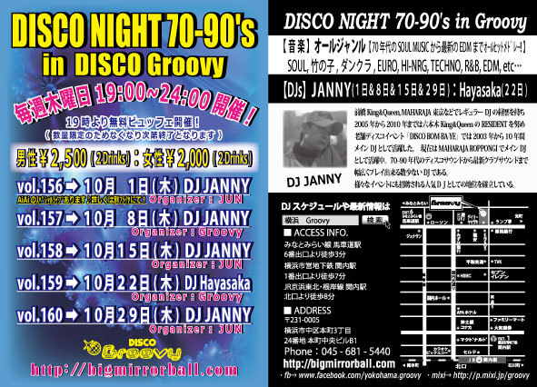 【毎週木曜日は!おなじみGroovyのディスコナイト】 70年代のSOULミュージックから最新のEDMまでオールヒットメドレー!踊れる曲盛り沢山でお贈りします♬ 【Organized By DISCO Groovy】 【DJ】 Hayasaka(DISCO Groovy) 【音楽】ALL GENRE (SOUL、竹の子、ダンクラ、EURO、HI-NRG、TECHNO、R&B、EDM、etc…) 【開催時間】 19:00〜24:00 【料金】 男性:¥2,500/2Drinks+ビュッフェ付 女性:¥2,000/2Drinks+ビュッフェ付 (ビュッフェは19時よりご用意しますが数量限定につき無くなり次第終了となります)
