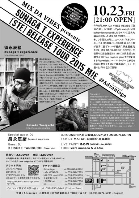 そして今回は、5月にニューアルバムをリリースし、DJ 30周年という節目を迎えた日本が世界に誇る“レコード番長”、須永辰緒氏を迎え、MIX DA VAIBESが10月23日、今夜限りの完全復活!!!!! さらには須永氏とも親交が深く“fox capture plan”などを輩出するPlaywrightレーベルオーナーでありDJの谷口慶介氏を迎えて最高のパーティーを創り上げる!! 乞うご期待!!