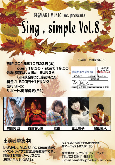 ¥·¥ó¥×¥ë¤Ê¥¹¥Æ¡¼¥¸¤ÎÃæ¤Ç¡¢¥¢¡¼¥Æ¥£¥¹¥È¤¬ ȯ¿®¤¹¤ë¤½¤Î²»³Ú¤¬¤½¤Î¤Þ¤Þ¤Î·Á¤È¤Ê¤Ã¤Æ ¤ªµÒÍͤο´¤ËÆÏ¤¯¥¤¥Ù¥ó¥È¥é¥¤¥Ö¡ÖSing,simple¡×¡£ º£Ç¯¡¢µ×¡¹¤Î³«ºÅ¤È¤Ê¤ê¤Þ¤¹¡ª ¤ª»þ´Ö¤¢¤ê¤Þ¤·¤¿¤é¡¢¤¼¤Ò¤ªµ¤·Ú¤Ë¤ª±Û¤·¤¯¤À¤µ¤¤¡ª --------------------------------- BIGMADE MUSIC Inc. presents ¡ÖSing,simple¡×vol.8 Æü»þ¡§2015ǯ10·î23Æü¡Ê¶â¡Ëopen18:30 / start19:00 ¾ì½ê¡§LIVE BAR BUNGA¡ÊJR²®·¦±ØË̸ýÅÌÊâ2ʬ¡Ë http://www.livebar-bunga.com/ ÎÁ¶â¡§1,500±ß¡Ü¥É¥ê¥ó¥¯ ¿Ê¹Ô¡§Ji-zo ½Ð±é¡§ Á°ÀîÂóÌé http://www.bigm