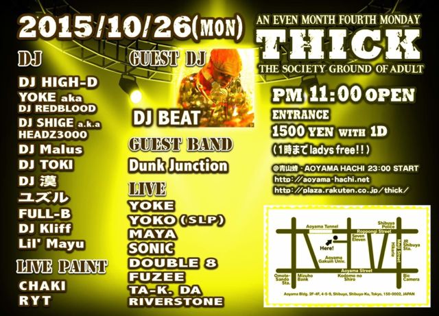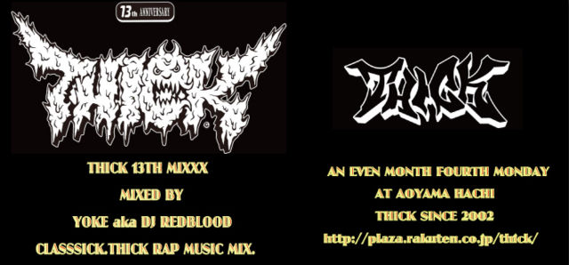 Íè½µ¤Î·îÍˤÏTHICK13¼þǯ¤¬³«ºÅ¡ª º£²ó¤Ï¤´Íè¾ì¤¤¤¿¤À¤¤¤¿Êý¤ÎÀèÃ壱£°Ì¾¤µ¤Þ¤Ë THICK 13TH MIXXX MIX BY YOKE aka DJ REDBLOOD MIX CD¤ò¥×¥ì¥¼¥ó¥È¤·¤Þ¤¹¡ª ¤³¤Î¤¿¤á¤À¤±¤Ë¿·¤¿¤ËMIX¤òÀ©ºî¤·¤Þ¤·¤¿¡£87¡ÁLATE 90S¤¢¤¿¤ê¤ÎHIPHOP¤Î Ç»¤¤¤¢¤¿¤ê¤ò½¸¤á¤Þ¤·¤¿¡£ À§ÈóOPEN23»þ¤«¤éÁá¤á¤ËGET¤·¤Ë¤¤Æ¤¤¤¿¤À¤±¤ì¤Ð¡ª next thick iz... 2015 /10/26¡Êmon¡Ë THICK £±£³¼þǯ venue :ÀÄ»³Ëª -AOYAMA HACHI http://aoyama-hachi.net/ PM11:00 OPEN ENTRANCE 1500 YEN WITH 1D ¡ú£±»þ¤Þ¤Çladys free