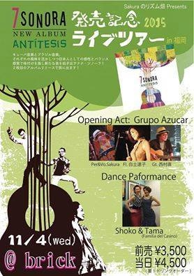 アコースティックラテンユニット [7sonora〜ナナ・ソノーラ〜] 9/13にセカンドアルバムをリリース!それに伴い全国各地周っています。 来週はいよいよ3年ぶりに九州へ上陸! お近くのみなさま、ぜひ遊びにいらしてください! 福岡公演は素晴らしいアーティストとのコラボもありますよ! ダンスインストラクターShoko先生のダンスパフォーマンス、 そして、九州を代表するパーカショニストSAKURAちゃんのユニット、Grupo Azucar 音とダンスが向き合い、その瞬間に躍動するエネルギーをどうぞお楽しみください! ◆11月4日(水)福岡 br