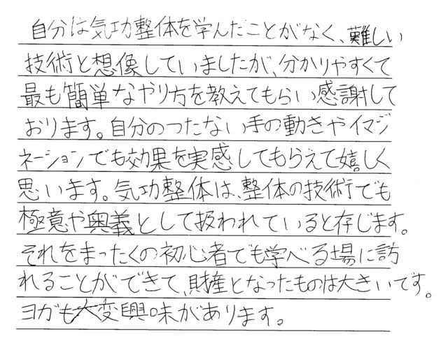 【ヨガの瞑想から生まれた、だれでも持っている気の力を発揮する最も実用的な方法です】 気功は特別な才能やつらく長い訓練が無くてもマスターできるテクニックです。 とくに、体の経絡の流れを整えることで簡単に体のゆがみやコリを解決して、しかも、揉まないので筋肉を痛めることもない理想的な施術方法&健康法です。 施術者として、自分の体のケアとして、他とは違う本格的な気功整体の技術を格安で提供しています。 。 【東洋医学の根本としての気】 当気功整体の講座は4レッスンで構成され、気の流れを整える2種類の技