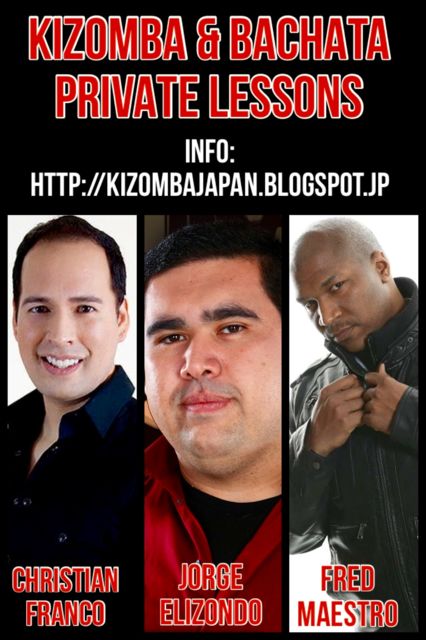JAPAN KIZOMBA FESTIVALの為来日する海外ダンサーのFred Maestro, Jorge Elizondo & Christian Francoのキゾンバとバチャータプライベートレッスン受講者を募集してます。レベルアップのチャンスです。 ◆料金 1人:1時間10,000円+スタジオ代 2人:1時間12,000円+スタジオ代 3人:1時間15,000円+スタジオ代 4人:1時間17,000円+スタジオ代 5人:1時間19,000円+スタジオ代 6人:1時間20,000円+スタジオ代 ◆会場(スタジオ代:1,000〜3,000円/1時間) JBA: http://tmstudio.info SALUD: http://www.club-salud.com GINZA
