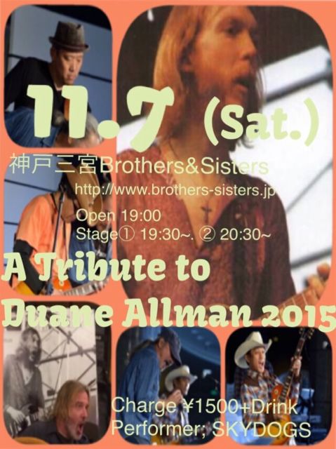 11·î7ÆüSKYDOGS¥é¥¤¥Ö¤·¤Þ¤¹¡£ ¤É¤¦¤¾¤è¤í¤·¤¯¤ª´ê¤¤¤·¤Þ¤¹¡£ SKYDOGS¤³¤ó¤Ê¥Ð¥ó¥É¤Ç¤¹¡£ ¥ª¥ê¥¸¥Ê¥ë¶Ê Thanks for comin' http://youtu.be/YFQNIvxlDXE ¥«¥Ð¡¼¶Ê WHIPPING POST http://youtu.be/X2pjIiVFaWc ¡ù¥é¥¤¥Ö¾ÜºÙ Detail of the Live Title:A Tribute to Duane Allman 2015 Date:2015/11/7(Sat.) Time:¡19:30¡Á,¢20:30¡Á Place:¿À¸Í»°µÜBrothers & Sisters http://www.brothers-sisters.jp Performer:SKYDOGS Charge:\1,500¡ÜDrink
