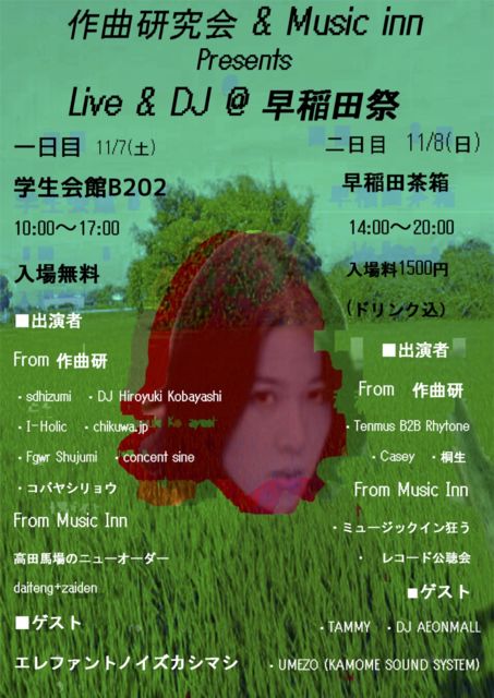 Áá°ðÅĺפˤª¤¤¤Æ¡¢Music Inn¤Ïº£Ç¯¤âºî¶Ê¸¦¤È¹çƱ¥¤¥Ù¥ó¥È¤ò¹Ô¤¤¤Þ¤¹¡ª ºòǯ¤Ë°ú¤Â³¤2Æü´Ö¤Ç¤Î³«ºÅ¤Ë¤Ê¤ê¤Þ¤¹¡ª ¤µ¤é¤Ë¡ª¡ª¡ªº£Ç¯¤ÏξÆü¶¦¤Ë¥²¥¹¥È¤ò¤ª¸Æ¤ÓÃפ·¤Þ¤·¤¿¡£³Ú¤·¤ß¤Ç¤¹¤Í¡ª 1ÆüÌÜ¥²¥¹¥È ¥¨¥ì¥Õ¥¡¥ó¥È¥Î¥¤¥º¥«¥·¥Þ¥· 2ÆüÌÜ¥²¥¹¥È DJ AEONMALL / TAMMY(Vinyl House) / UMEZO(KAMOME SOUND SYSTEM) 1ÆüÌÜ 11/7(ÅÚ) ³ØÀ¸²ñ´ÛB202 10:00~17:00 Free Entrance ¥¿¥¤¥à¥Æ¡¼¥Ö¥ë/½Ð±é¼Ô 10:00~10:20 Tenmusu 10:20~11:00 concent sine 11:00~11:40 ¥³¥Ð¥ä¥·¥ê¥ç¥¦ 11:40~12:20 ¹âÅÄÇϾì¤Î¥Ë¥å¡¼¥ª¡¼¥À