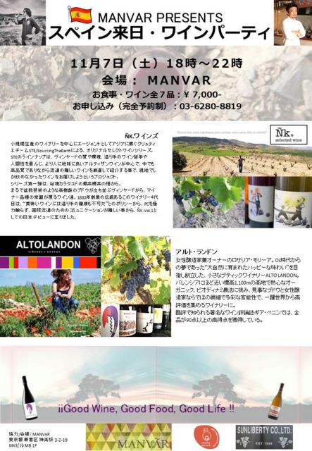 ¡¡ÑK¥ï¥¤¥ó¤ÈAlto Landon¤ÎÁ´¤Æ¤Î¥ï¥¤¥ó¤¬³Ú¤·¤á¤ë¥ï¥¤¥ó¥Ñ¡¼¥Æ¥£¡¼!! 11·î7Æü¡ÊÅÚ¡Ë¡¢¥¹¥Ú¥¤¥ó¤è¤êÍèÆü¤¹¤ë¥Ñ¥Ö¥í¡¦¥¢¥í¥Þ¡¼¥ë»áΨ¤¤¤ë¥¯¥ê¥å¥Æ¥£¥¨¥Á¡¼¥àSTE/Sourcing The Earth¤Ë¤è¤ë¥ª¥ê¥¸¥Ê¥ë¥»¥ì¥¯¥È¥ï¥¤¥ó¥·¥ê¡¼¥º¤Î¿·È¯Çä¤òµÇ°¤·¤Æ¡¢ ¿À³Úºä¤Î¿Íµ¤¥¹¥Ú¥¤¥óÎÁÍýŹMANVOR¡Ê¥Þ¥ó¥ï¡¼¥ë¡Ë¤Ë¤Æ¥Ñ¥Ö¥í»á¤ò°Ï¤ß¡¢¥ï¥¤¥ó¤ÈÈÁÂ¥·¥§¥Õ¤¬ºî¤ëÎÁÍý¤Î³Ú¤·¤à¥³¥é¥Ü¥ì¡¼¥·¥ç¥ó¥¤¥Ù¥ó¥È¤ò³«ºÅÃפ·¤Þ¤¹¡£ MANVAR¤é¤·¤¤È¾Î©¿©¥¹¥¿¥¤¥ë¤Î¥«¥¸¥å¥¢¥ë¤ÇÈþÌ£¤·¤¤¥Ñ¡¼¥Æ¥£¡¼¤Ë¤Ê¤Ã¤Æ¤ª¤ê¤Þ¤¹¡£ ÑK¥ï¥¤¥ó¤È¤È¤â¤Ë¤´ÍѰդ¹¤ë¥ï¥¤¥ó¤Ï¡¢