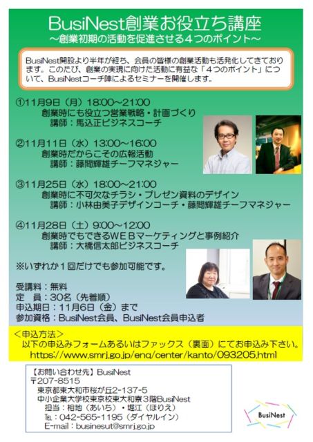 BusiNest¡Ê¥Ó¥¸¥Í¥¹¥È¡Ë³«Àߤè¤êȾǯ¤¬·Ð¤Á¡¢²ñ°÷¤Î³§ÍͤÎÁÏ¶È³èÆ°¤â³èȯ²½¤·¤Æ¤¤Æ¤ª¤ê¤Þ¤¹¡£¤³¤Î¤¿¤Ó¡¢Á϶Ƚé´ü¤Î³èư¤òÂ¥¿Ê¤µ¤»¤ë¡Ö£´¤Ä¤Î¥Ý¥¤¥ó¥È¡×¤Ë¤Ä¤¤¤Æ¡¢BusiNest¥³¡¼¥Á¿Ø¤Ë¤è¤ë¡ÖÁ϶ȤªÌòΩ¤Á¹ÖºÂ¡×¤ò³«ºÅ¤·¤Þ¤¹¡£ ¡¡http://businest.smrj.go.jp/?p=2015 ¢¡³«ºÅÆü»þ¡¦¹Ö»Õ £±¡¥11·î9Æü¡Ê·î¡Ë18:00¡Á21:00¡¡ ¡¡¡¡¡ÖÁ϶Ȼþ¤Ë¤âÌòΩ¤Ä±Ä¶ÈÀïά¡¦·×²è¤Å¤¯¤ê¡× ¡¡¡¡¡¡¡¡¹Ö»Õ¡§ÇϹþÀµ ¥Ó¥¸¥Í¥¹¥³¡¼¥Á £²¡¥11·î11Æü¡Ê¿å¡Ë13:00¡Á16:00¡¡ ¡¡¡¡¡ÖÁ϶Ȼþ¤À¤«¤é¤³¤½¤Î¹Êó³èư¡× ¡¡¡¡¡¡¡¡¹Ö»Õ¡§Æ£´Öµ±Íº ¥Á¡¼¥Õ¥Þ¥Í¥¸¥ã¡¼ £³¡¥