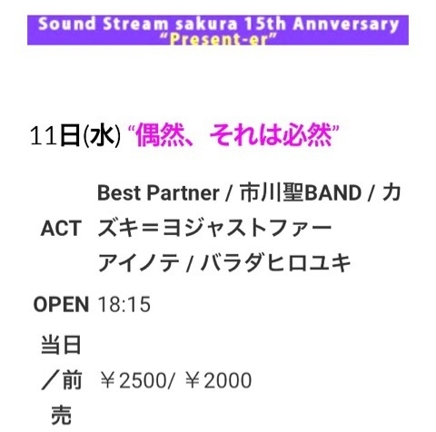 ¢¨ ¥«¥º¥¡á¥è¥¸¥ã¥¹¥È¥Õ¥¡¡¼ ¡È¶öÁ³¡¢¤½¤ì¤ÏɬÁ³¡É ACT¡¡Best Partner / »ÔÀîÀ»BAND / ¥«¥º¥¡á¥è¥¸¥ã¥¹¥È¥Õ¥¡¡¼ / ¥¢¥¤¥Î¥Æ / ¥Ð¥é¥À¥Ò¥í¥æ¥ OPEN 18:15 START 18:45 ÅöÆü¡¿Á°Çä ¡ï2500/ ¡ï2000 ½Ð±éͽÄê»þ´Ö¢Í¡¡21»þ25ʬ¡Á Sound Stream sakura ¢©285-0846 ÀéÍÕ¸©º´ÁÒ»Ô¾å»ÖÄÅ1785-3 ´ä°æ¥Ó¥ë2F TEL¡õFAX¡§043-463-5963