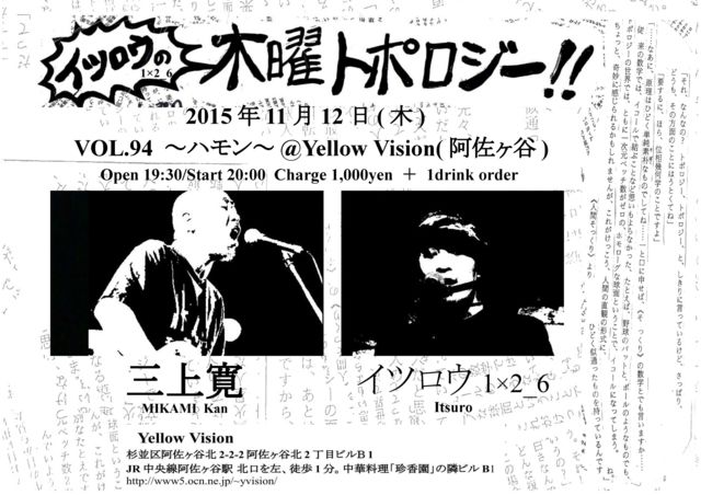 °¤º´¥öë¤ÎYellow Vision¤Ç¡¢·î£²²ó(Âè2/Âè4ÌÚÍËÆü)³«ºÅ¤·¤Æ¤¤¤ë¼Â¸³/¸¡¾Ú¥é¥¤¥Ö´ë²è¡Ú¥¤¥Ä¥í¥¦1¡ß2_6¤Î"ÌÚÍË¥È¥Ý¥í¥¸¡¼¡ª"¡Û¤Î£¹£´²óÌÜ¡ª 2015ǯ11·î12Æü(ÌÚ) Yellow Vision(°¤º´¥öë) ¡Ú¥¤¥Ä¥í¥¦1¡ß2_6¤Î"ÌÚÍË¥È¥Ý¥í¥¸¡¼¡ª"¡Û vol.94¡Á¥Ï¥â¥ó¡Á op19:30 st20:00 1,000±ß¡Ü1drink ½Ð±é¡§ »°¾å´² ¥¤¥Ä¥í¥¦1¡ß2_6 ¢¨vol.57°ÊÍè¤Î»°¾å´²¤µ¤óÅо졪³Æ¥½¥í¤Î¤¢¤È¤Ë¡¢¥Ç¥å¥ª¥»¥Ã¥·¥ç¥ó¤â¤¢¤ê¡£ ~~~~~~~~~~~~~~~~~~~~~~~~~~~~~~~~~~~~~~~~~~~~~~~~~~~~~~~~~~~~~~~~~~~~~~~~~~~~~~~~~~~~ ¡Ö¤½¤ì¡¢¤Ê¤ó¤Ê¤Î¡©¡¡¥È¥Ý¥í¥¸¡¼¡¢¥È¥Ý¥í