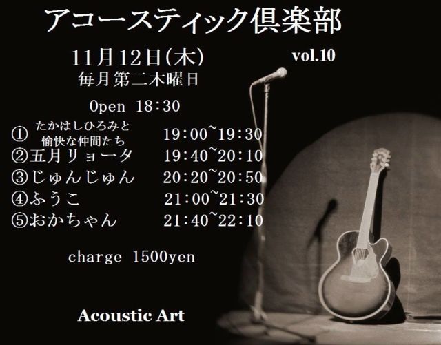 ¥¢¥³¡¼¥¹¥Æ¥£¥Ã¥¯¶æ³ÚÉô¡¡vol.10 ¡¡Ëè·îÂèÆóÌÚÍËÆü 11·î12Æü(ÌÚ) 18:30 Open¡Á ¡¤¿¤«¤Ï¤·¤Ò¤í¤ß ¤ÈÌû²÷¤ÊÃç´Ö¤¿¤Á 19:00~19:30 ¢¸Þ·î¥ê¥ç¡¼¥¿ 19:40~20:10 £¤¸¤å¤ó¤¸¤å¤ó 20:20~20:50 ¤¤Õ¤¦¤³ 21:00~21:30 ¥¤ª¤«¤Á¤ã¤ó 21:40~22:10 charge1500yen
