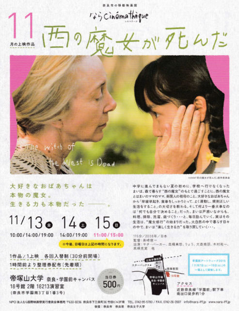 管理人様、不適切であれば削除ください。告知させていただきます。 ならシネマテークは映画館のない奈良市各所にて1ヶ月に3日間オープンする移動型の映画館。 11月のシネマテークは、11月13日から15日までの3日間、帝塚山大学 奈良・学園前キャンバス18号館2階演習室をお借りして開催します。 上映作品は、「西の魔女が死んだ」。梨木香歩さんの同名小説を「ロックよ、静かに流れよ」「8月のクリスマス」の長崎俊一が脚本・監督をつとめたハートフルな名作です。主演のおばあちゃんを演ずるのはサチ・パーカーさん。あの名女優シャーリー
