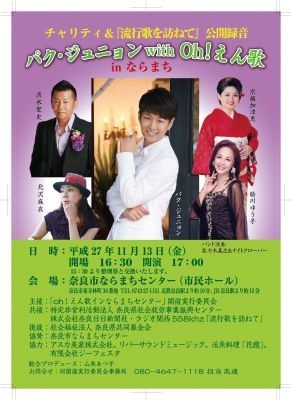 ト 2015/11/13 ラジオ関西「流行歌を訪ねて」公開録音コンサート(奈良) チャリティ&「流行歌を訪ねて」公開録音 パク・ジュニョンwith Oh!えん歌inならまち 2015年11月13日(金) 開場16:30 開演17:00 会場:奈良市ならまちセンター(市民ホール) 住所:奈良市東寺林町38番地 アクセス:http://naramachicenter.web.fc2.com/ 電車:近鉄奈良駅より約10分、JR奈良駅より約15分 お車:地下駐車場をご利用ください。 自転車又はバイク:センター西側駐輪場をご利用ください。 出演:パク・ジュニョン 清水聖史/