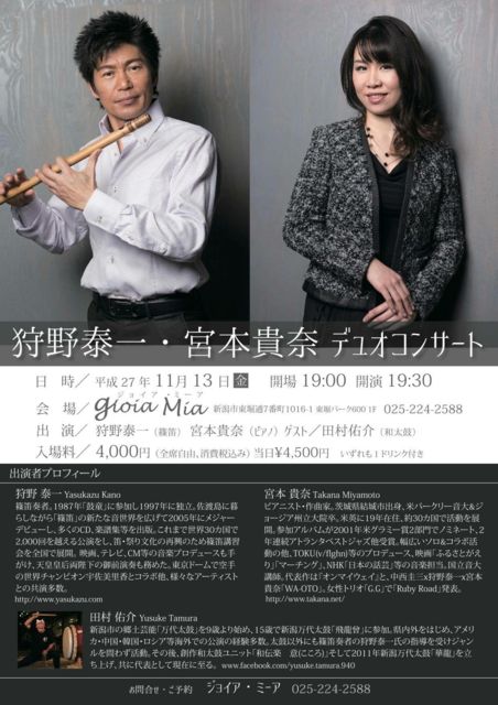 11月13日(金) 新潟県新潟市古町 ジョイアミーア 狩野泰一&宮本貴奈 デュオコンサート、ゲスト:田村佑介(和太鼓) 出演 : 狩野泰一(篠笛)、宮本貴奈(ピアノ)、田村佑介(和太鼓) 時間 : Open 19:00 / Start 19:30 料金 : 前売\4,000 / 当日\4,500 会場 : ジョイアミーア 住所 : 新潟市東堀通7番町1016-1 東堀パーク600 1F TEL :025-224-2588 ※お問合わせ、ご予約は直接「ジョイアミーア」あてにお願いします。まだ、間に合います。ご予約はお早めに!