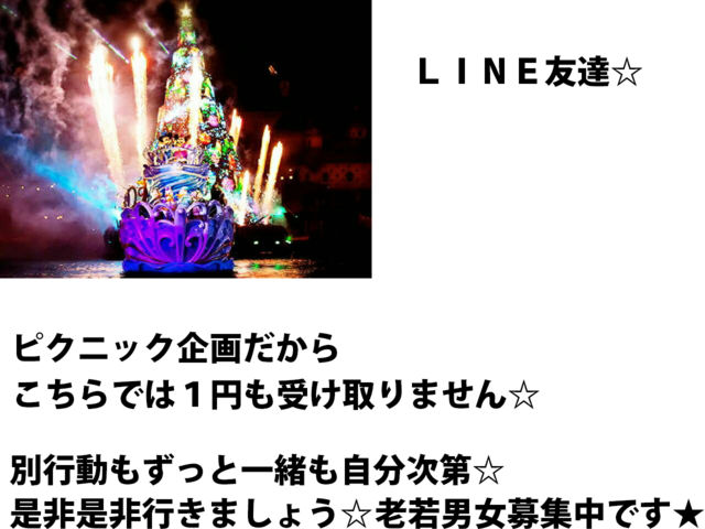 ¡û¥Ô¥¯¥Ë¥Ã¥¯´ë²è¤À¤«¤é»²²ÃÈñ̵ÎÁ¡ù³§¤Ç¥Ç¥£¥º¥Ë¡¼¥·¡¼¤Ë¹Ô¤³¤¦¤è¡ù£±£±¡¥£±£µÆüÍË¡ù¥ß¤ª»Ò¤µ¤ó¤ä½é»²²Ã¡¦°ì¿Í»²²Ã¤â¤´°Â¿´¤Ç¤¹¡ù¡¡ ¡ü±«Å··è¹Ô ¡ü LINEͧã½é¤ÎTDS LINEͧã½é¤ÎTDR¥¯¥ê¥¹¥Þ¥¹ TDR¤Îǯ´Ö¥¤¥Ù¥ó¥È¤Ç °ìÈÖÌë·Ê¤Î¤¤ì¤¤¤Ê¥¤¥Ù¥ó¥È¡£ TDS¤Î¿åÃæ¥¯¥ê¥¹¥Þ¥¹¥Ä¥ê¡¼¤Ï¡¢¸¸ÁÛŪ¤ÇåºÎï¤Ç¤¹¡£ ¥°¥Ã¥º¤â ¥Ï¥í¥¦¥£¥ó»þ´ü¤ËÉ餱¤Ê¤¤¤¯¤é¤¤²Ä°¦¤¤¤Î¤Ç¡¢½÷»Ò¤ËÂç¿Íµ¤¡£ ¥ß¥Ã¥¡¼¥µ¥ó¥¿¤È µÇ°¼Ì¿¿¤ò»£¤Ã¤Æ ¤ß¤ó¤Ê¤Ë¼«Ëý¤·¤Á¤ã¤ª¤¦¡£ ¡ü ¥µ¡¼¥¯¥ë¤È¤·¤Æ°ì½ï¤Ë¹Ô¤³¤¦¤è¤Ã¤Æ¸À¤¦´ë²è¤Ç¤¹¡ú ¤Ç¤¹¤Î¤Ç¤´¼«¿È¤Ç¡¢¥Á¥±¥Ã¥È¤«¤é¡¢